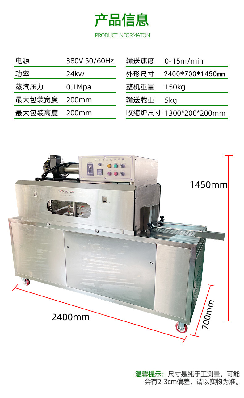 收縮速度快:蒸汽的高熱量能夠快速傳遞給包裝膜,使包裝膜迅速收縮,提高包裝效率,可適用于高速生產線,滿足大規模生產的需求.
