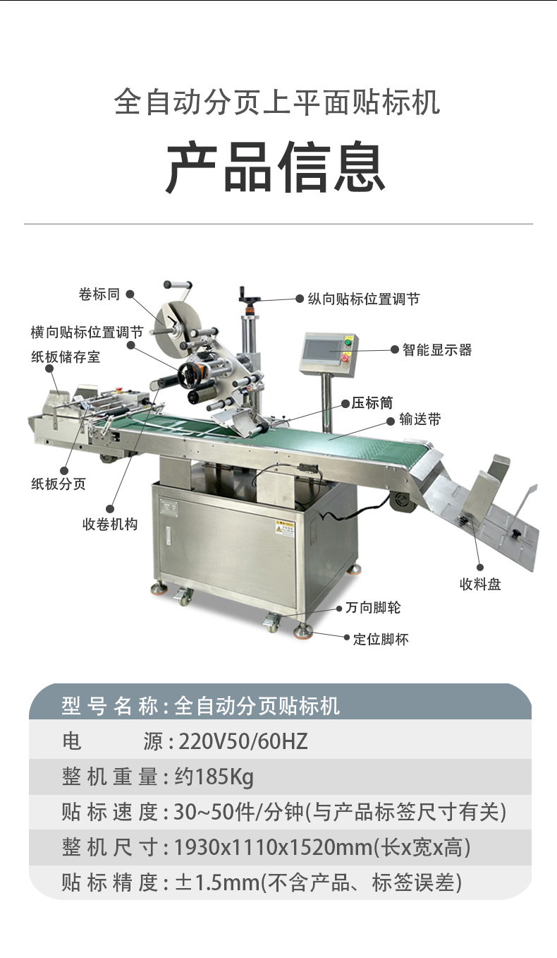 東莞市中堡智能科技實(shí)業(yè)有限公司的全自動(dòng)分頁(yè)貼標(biāo)機(jī):可應(yīng)用于紙片、名片、標(biāo)簽、各種材質(zhì)的卡片、電話卡、IC 卡、IP 卡、游戲沖值卡、塑料復(fù)合包裝袋、紙盒片、紙袋等各種厚度各種材質(zhì)的片狀物品的自動(dòng)分頁(yè),并進(jìn)行貼標(biāo)。以 ±1mm 超高精度和 0-100 個(gè) / 分鐘的極速性能,支持多種標(biāo)簽類型,廣泛應(yīng)用于電子、五金、塑膠、化工等行業(yè)。