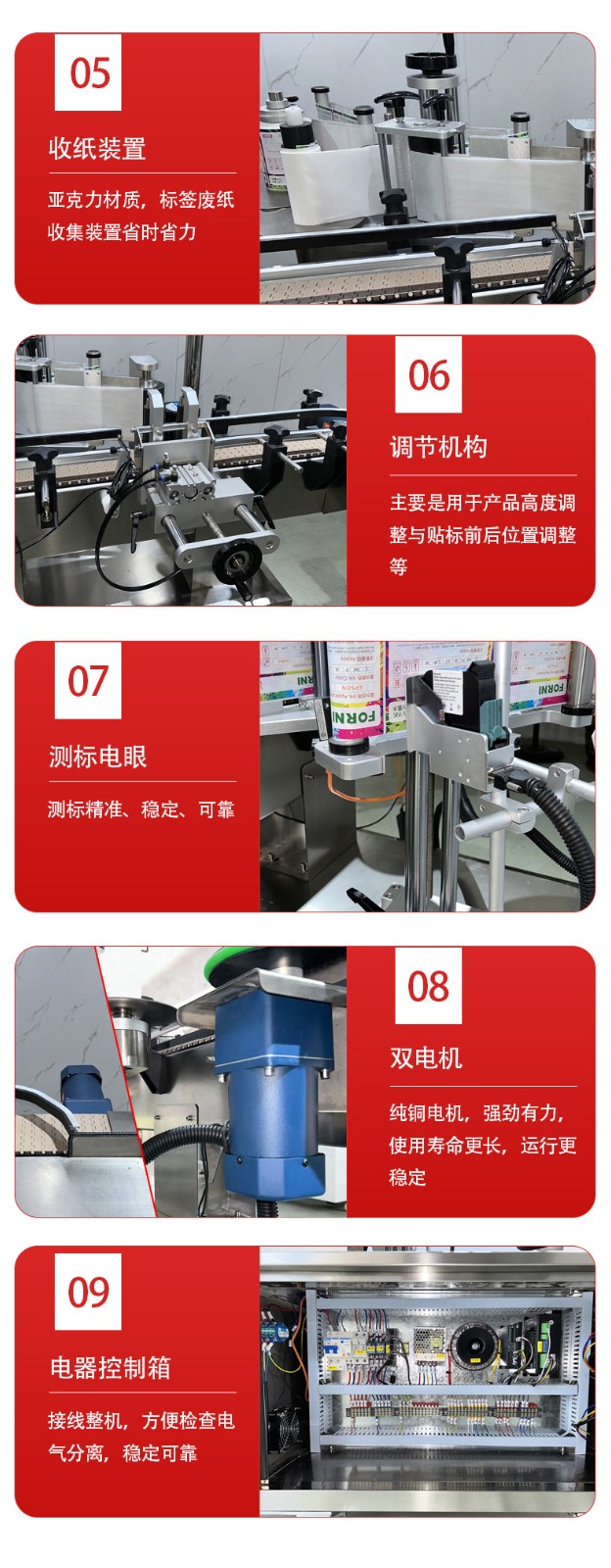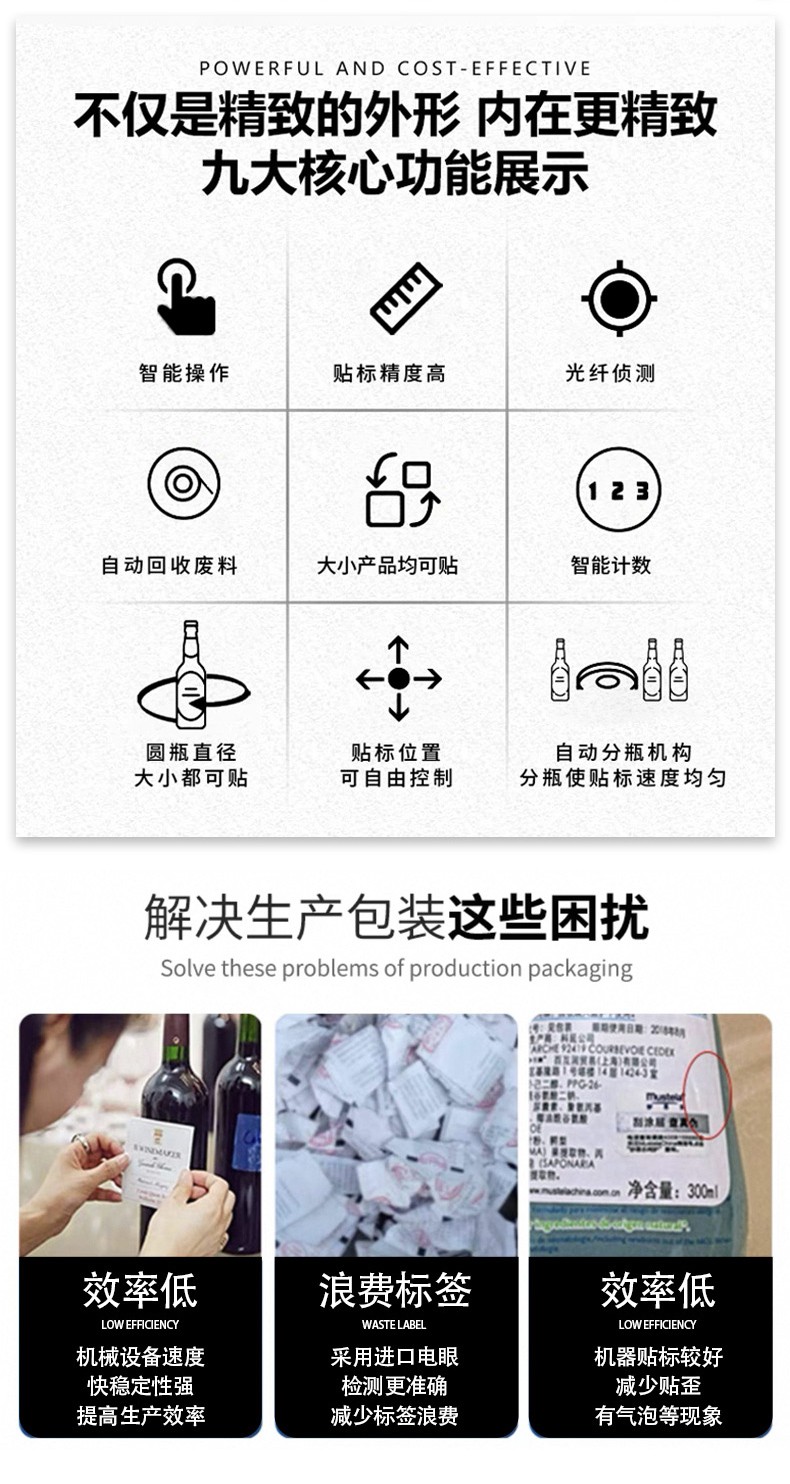 圓瓶定位貼標(biāo)機(jī)的核心優(yōu)勢(shì)是精準(zhǔn)度高、適配性強(qiáng)、自動(dòng)化程度高,其效率則體現(xiàn)在穩(wěn)定的貼標(biāo)速度和低故障率上,能顯著降低人工成本并提升包裝一致性。
