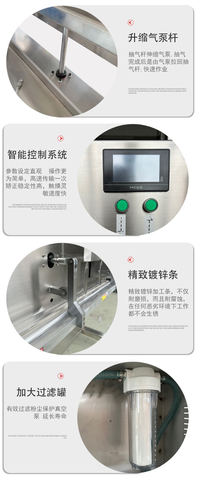 可定制與多模式適配不同尺寸:部分機(jī)型支持封口規(guī)格定制,封口長度可達(dá)到 800mm、1000mm 甚至 1200mm 等,適配不同寬度的包裝袋。同時(shí),部分先進(jìn)機(jī)型預(yù)設(shè)多組工作模式,可快速切換真空、充氣、封口等流程,適配從小袋糕點(diǎn)到大袋五金模具等不同尺寸、類型產(chǎn)品的包裝需求。