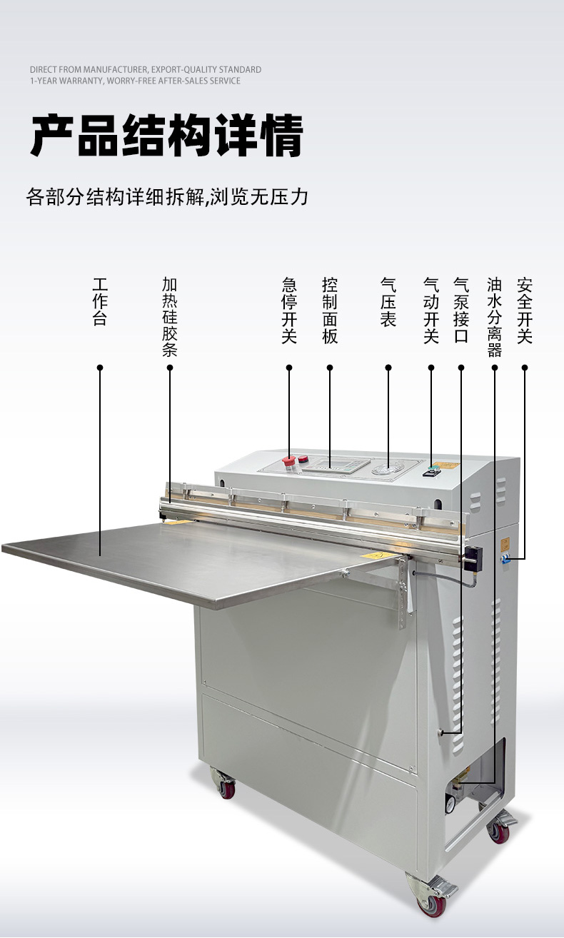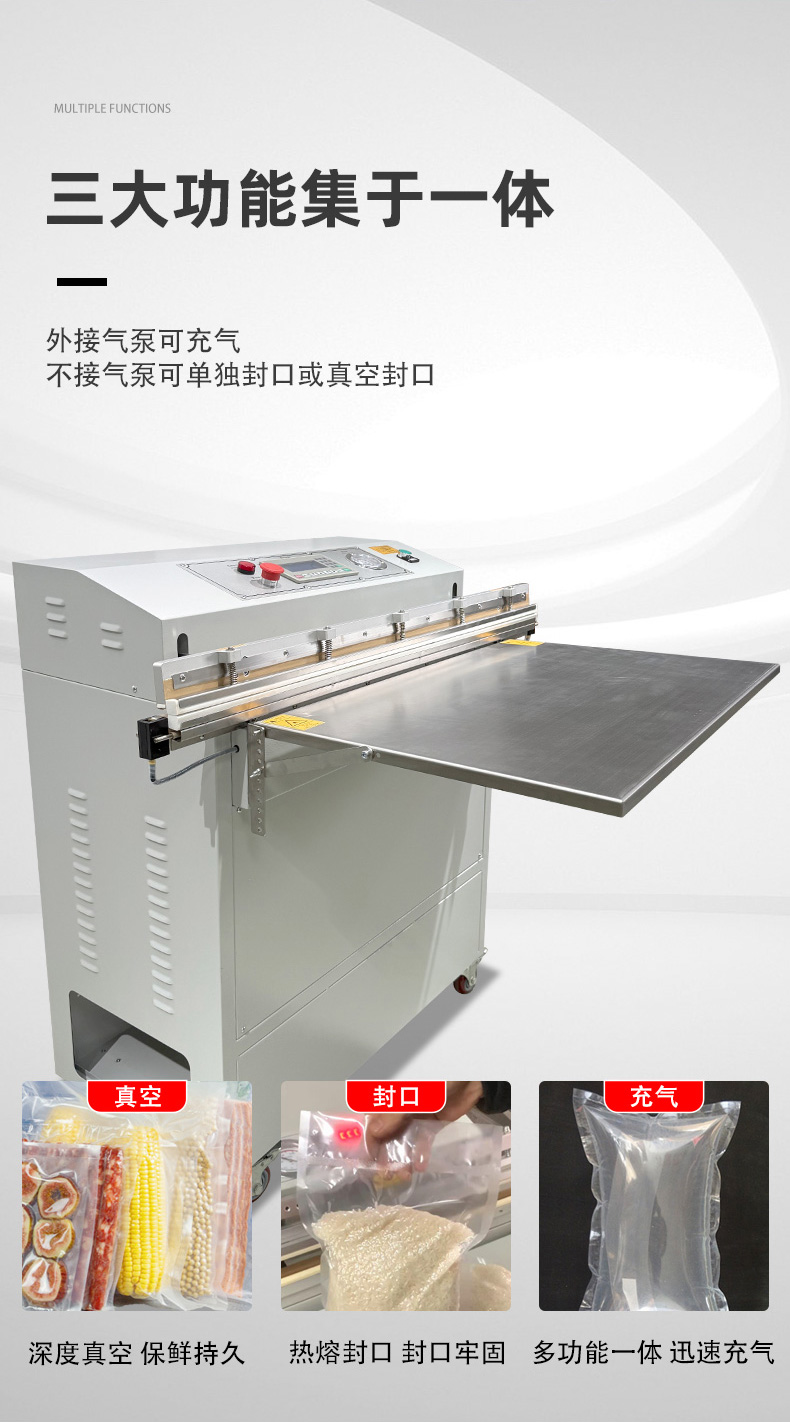 - 外抽真空包裝機的熱封條通常位于抽氣嘴下方或封口機構處,外部有金屬防護蓋(防止誤觸高溫)。