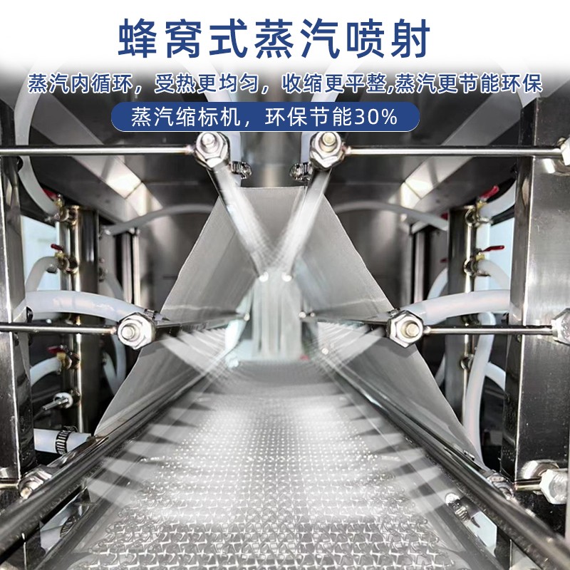 簡化操作與管理流程,降低人工學習成本分體式設備需要分別操作蒸汽發生器和收縮機:先啟動發生器預熱,待蒸汽壓力達到設定值后,再開啟收縮機輸送系統,操作過程中需頻繁往返查看兩臺設備的參數,調整難度大,對操作人員的專業要求較高。蒸汽收縮一體機配備集成式智能控制面板,將蒸汽溫度、壓力、輸送速度、收縮時間等核心參數集中顯示與調控。操作人員僅需在面板上輸入產品包裝要求的參數,設備即可自動完成蒸汽發生、恒溫輸送、精準收縮的全流程作業,無需單獨管控蒸汽發生器。同時,設備內置故障自檢系統,可實時監測蒸汽發生模塊的運行狀態,一旦出現異常(如缺水、壓力不穩),會立即發出警報并自動停機,相比分體式設備的 “雙機分別巡檢”,操作步驟減少 60% 以上,新人僅需簡單培訓即可上崗,有效降低人工管理成本與操作失誤率。