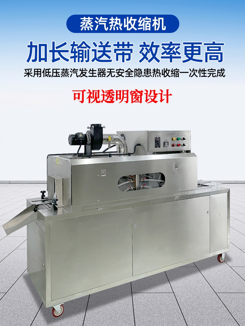 減少設備占用空間,適配多場景布局需求傳統蒸汽收縮包裝方案中,獨立蒸汽發生器體積較大,需與收縮機分開放置,還需預留管道連接的空間,整體占地面積大,對廠房面積較小的中小企業或生產線布局緊湊的場景極不友好。而蒸汽收縮一體機通過結構優化,將蒸汽發生模塊內嵌于設備主機框架內,采用垂直分層或側置內嵌的緊湊設計,整體占地面積相比 “分體式設備組合” 減少 30%-50%。這種集成化設計不僅能輕松適配車間狹窄區域、流水線嵌入式工位,還可靈活移動至臨時包裝作業區,無論是固定生產線還是臨時加工點,都能高效利用有限空間。