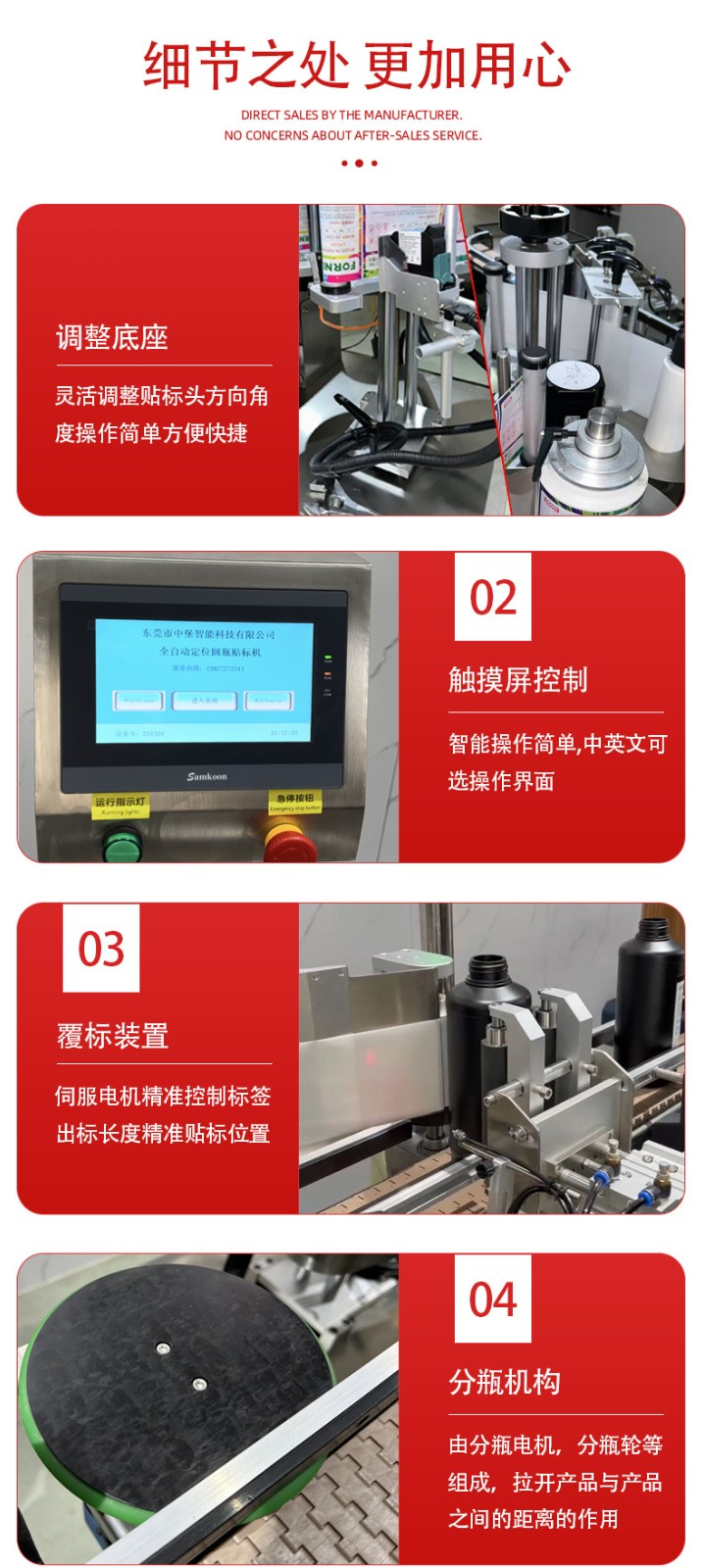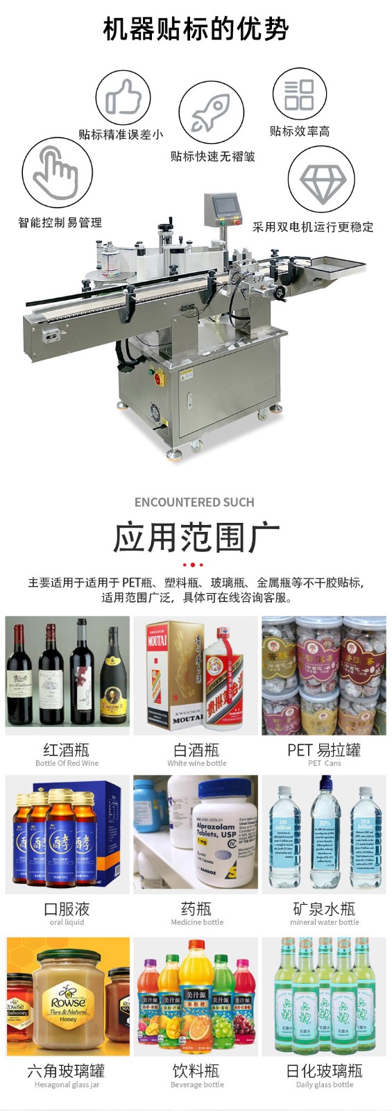 圓瓶類(lèi)產(chǎn)品的貼標(biāo),可貼單標(biāo)和雙標(biāo),正背雙標(biāo)間距可靈活調(diào)整,部分機(jī)型還具備錐形瓶貼標(biāo)功能。精準(zhǔn)定位、高效智能、靈活兼容與合規(guī)耐用,可顯著提升產(chǎn)線(xiàn)自動(dòng)化與貼標(biāo)良率。