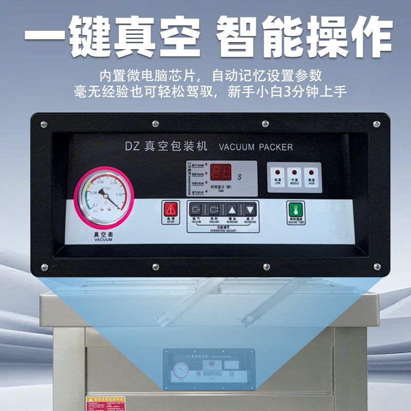 - 回氣與開蓋:當達到設定熱封時間時,熱封指示燈熄滅,真空室經電磁閥進入大氣,直至機蓋自動抬啟,取出包裝好的產品,完成一次包裝循環。